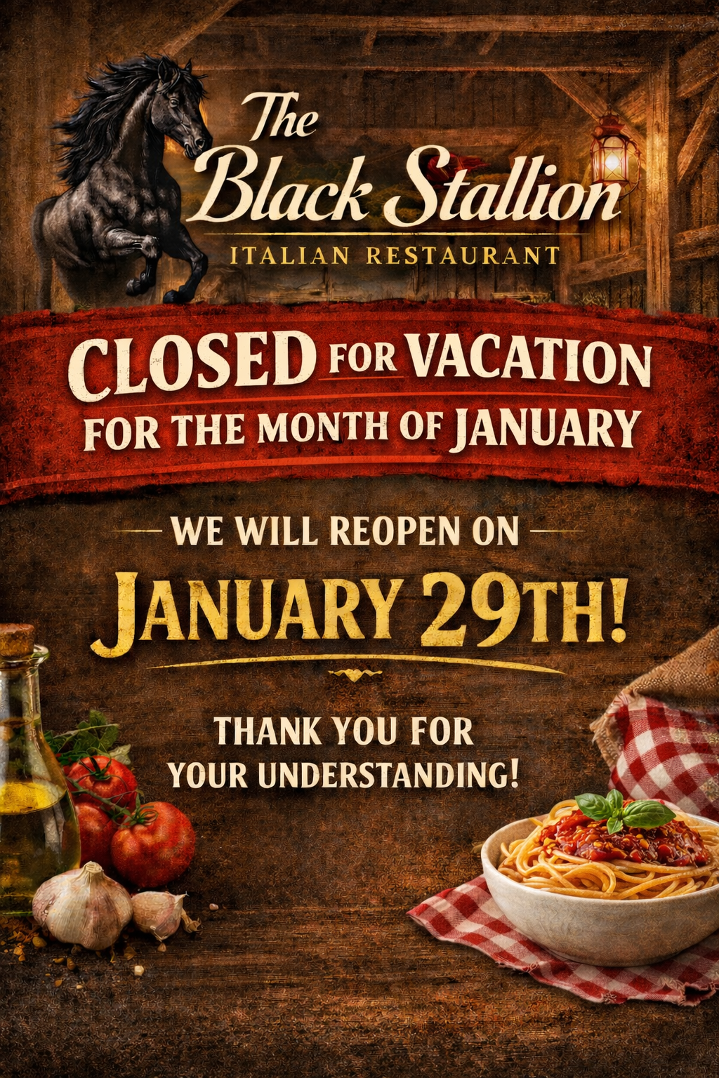 The Black Stallion, located on Route 5 in Vernon New York, was established in 1972 by Gino and Maria Vullo. Gino and Maria’s love for their native Italian cuisine and their ability to make all who dined with them feel special and welcome, is the reason that the restaurant is still successful today.