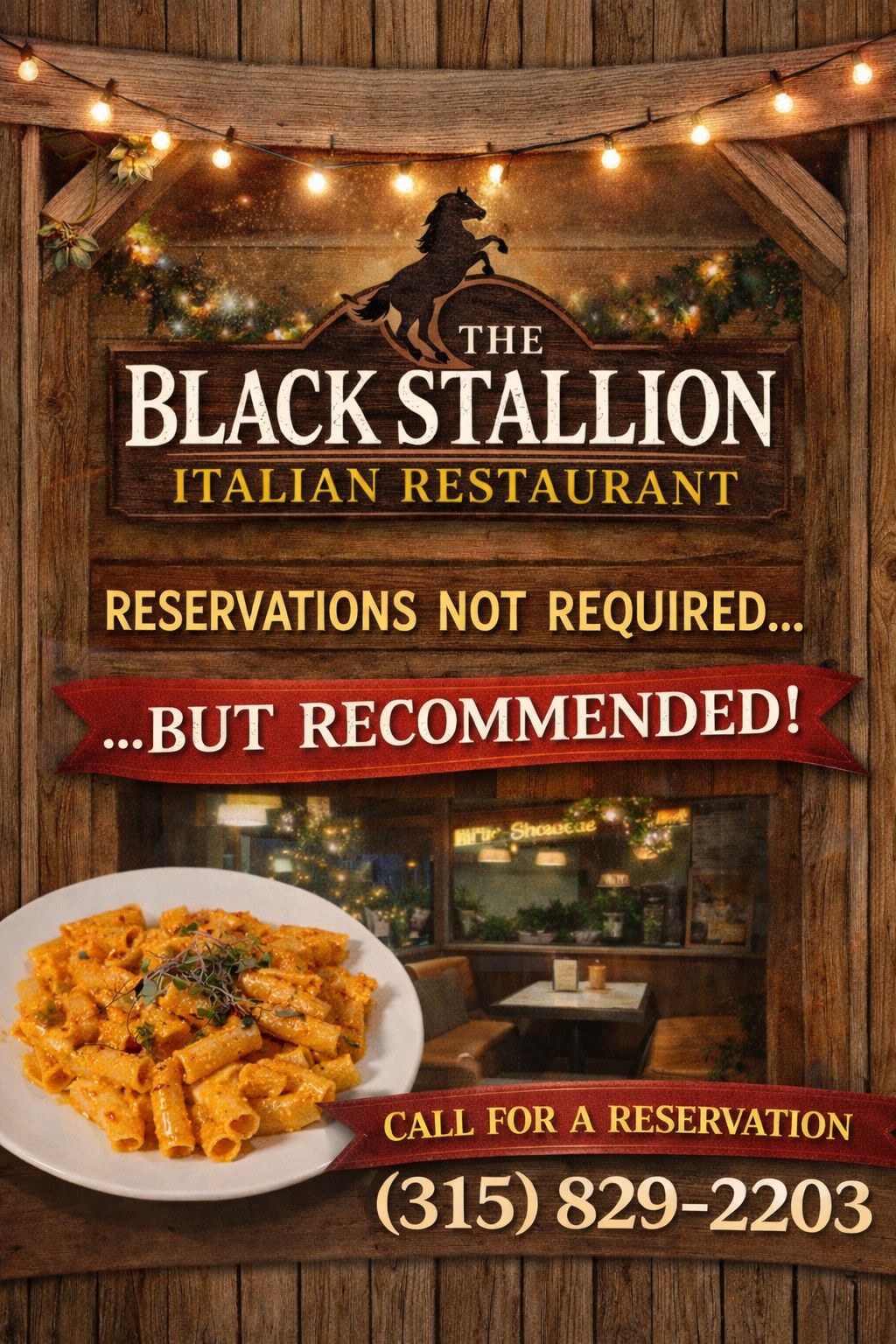With Jeff’s input and some of the classic recipes brought from Italy by Sal’s parents, they have created a memorable dining experience. Conclude your meal with one of the restaurants home made desserts, created by Francine Williams. Come see why the Black Stallion is favored by so many in Central New York.